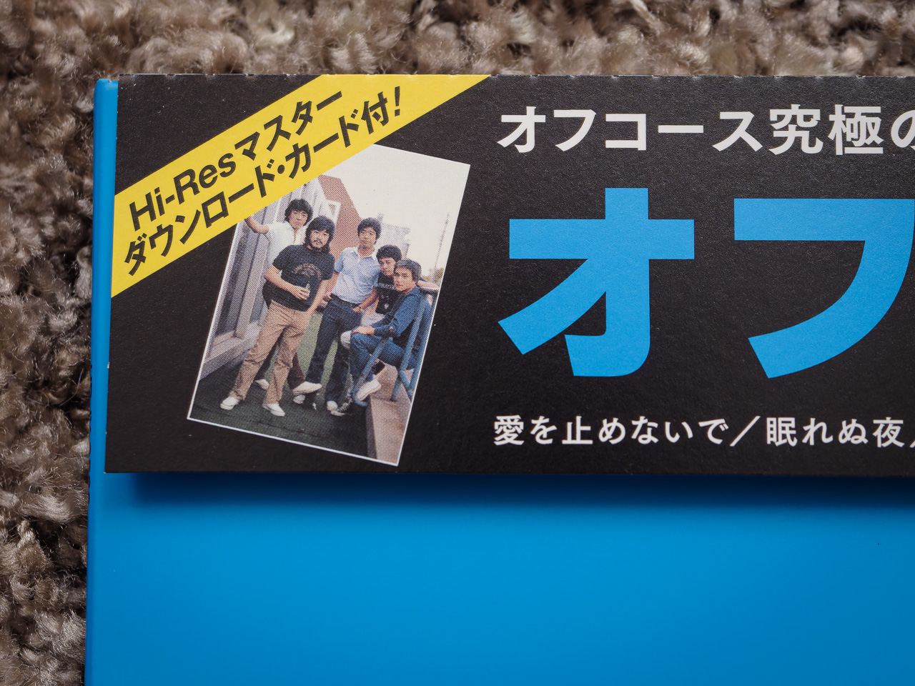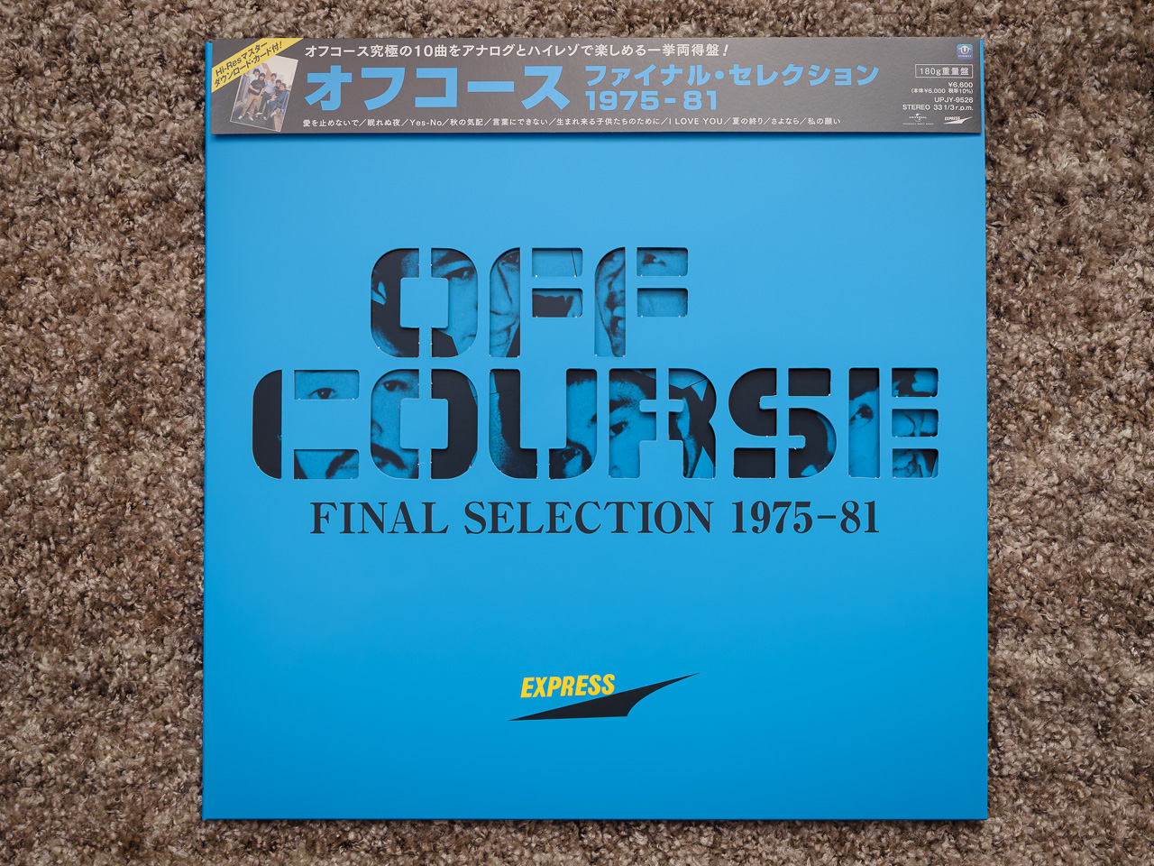 「OFF COURSE」の文字が切り抜かれていて、中にあるレコードスリーブに印刷されているメンバーの顔が見えるという、お値段だけあってとても凝ったジャケット。レコードは重量盤というのはいいんだけどさー、もう見た目に溝が浅いというのかなー、カッティングレベル(=音量)低そうでアレ。現役時代に出たベスト盤も溝が浅い。曲が長いから仕方がないのかもしれないけど。