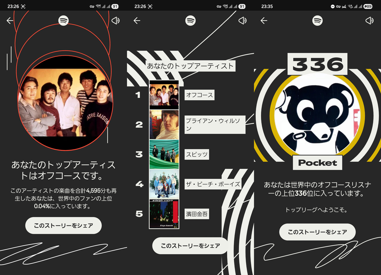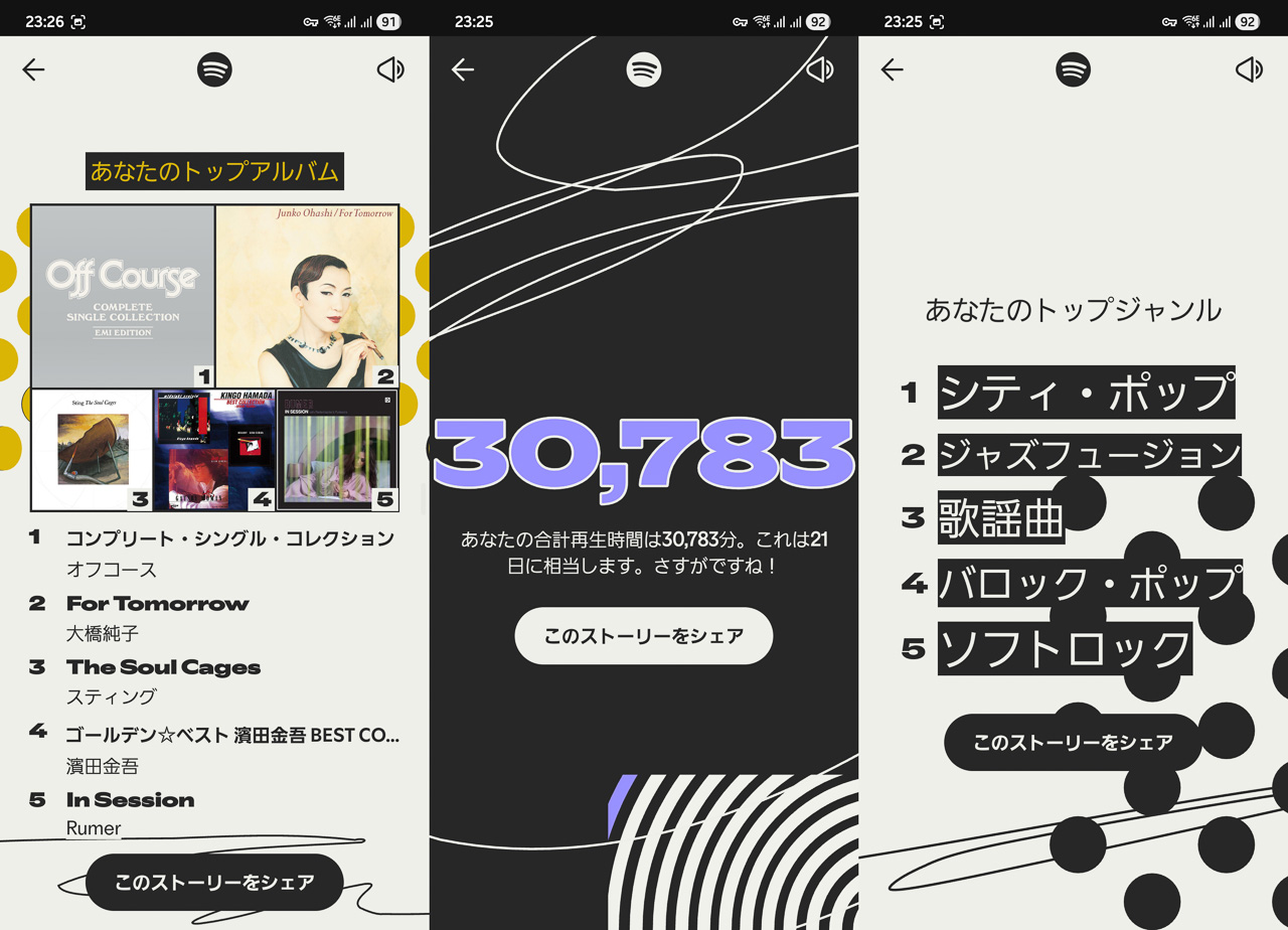 ちょっと前に「Spotifyまとめ」の通知が来た。それによると、合計再生時間が30,783分(曲数かと思ったら時間だった)、今年いちばん聴いたのはオフコースのベスト盤とのこと。大橋純子もスティングもしつこく聴いた記憶があるけど、浜田金吾のベスト盤とRumerの新作はそんなに聴いたかなぁ?という感じ。Spotifyでは同じものを繰り返し聴くことはあんまりないから、数回でも上がってきてしまうのかもしれない。