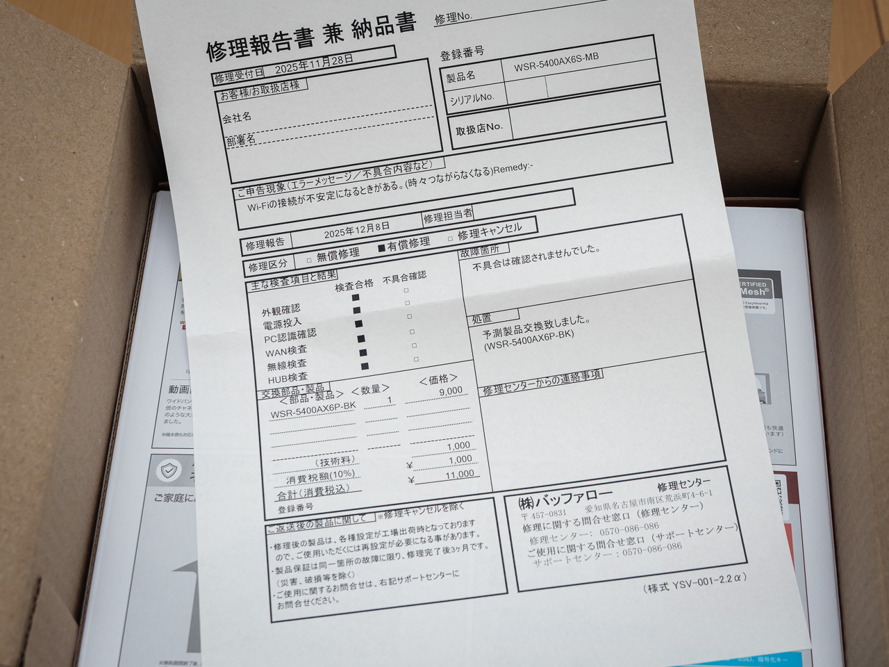 不調の「WSR-5400AX6S」をどうするか…マイナーチェンジ(セキュリティサービスの会社が違うだけ)した「WSR-5400AX6P」はまだ現行モデルだし、このまま捨てるにはちょっと惜しいスペックだから修理に出してみることにした。バッファローの修理受付はとても分かりやすくキッチリしているように見せかけて、専用フォーマットの書類をダウンロードして添付したりと「こんな手間かかるならやめようかな」と思わせる感じ。それでもきちんと段取りを踏んで送り出した結果…「異常は確認できなかった。間欠故障の可能性もあるから、予防修理として後継機種のWSR-5400AX6Pに11,000円で交換するけどどうする?(意訳)」という返答が来た。