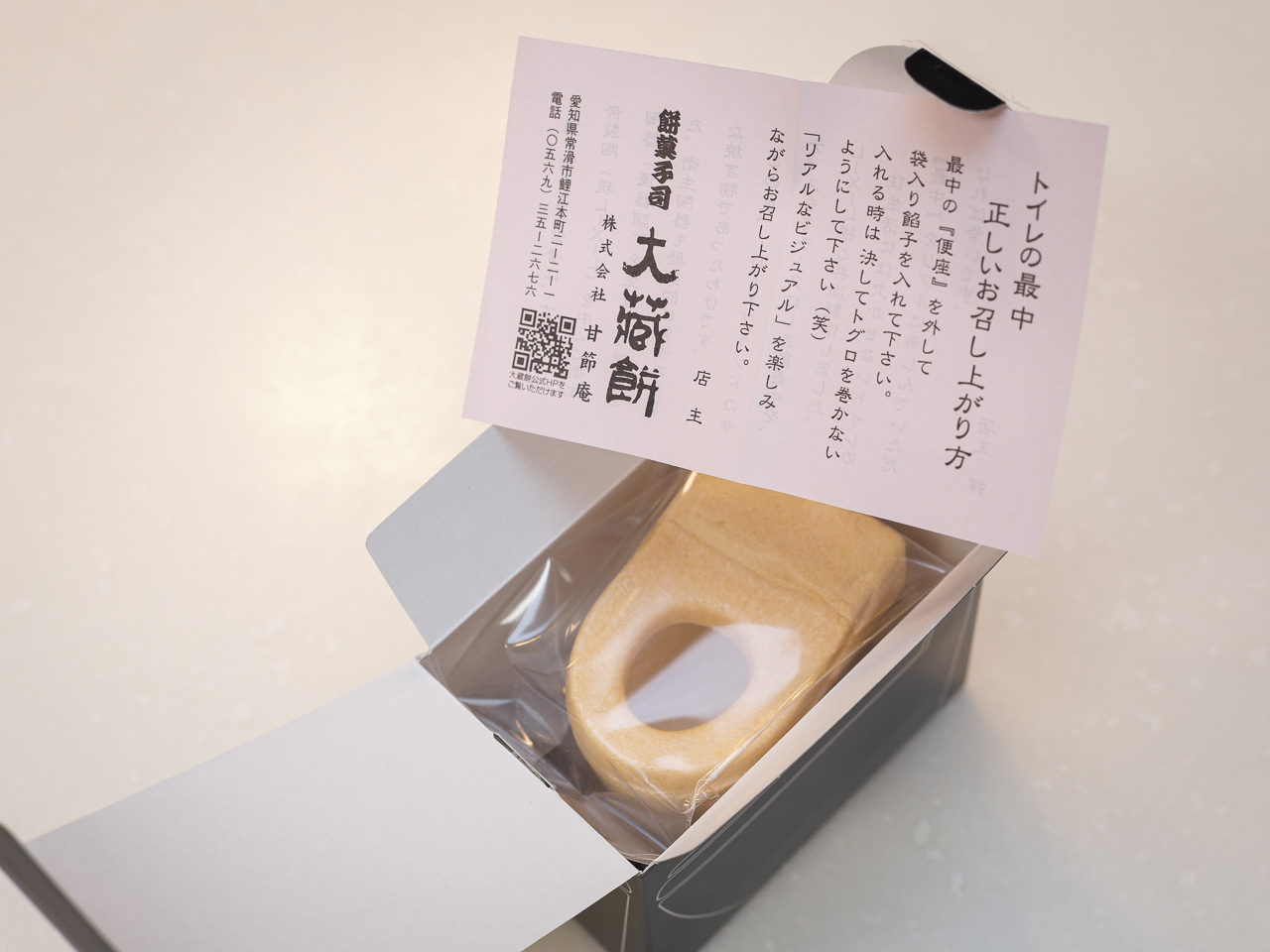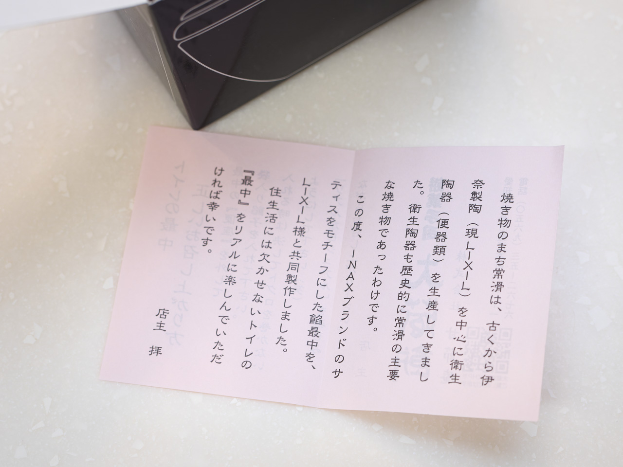 はやる気持ちを抑えながらカッターで慎重にテープをカットして開封。最初に出てくるのはピンク色の説明書。「便座を外してあんこを入れる時に決してトグロを巻かないように」とのこと。昔々に「決してひとりでは見ないでください」っていう映画あったなぁ。「決して」しか合ってないけど(笑) 愛知県の常滑にある和菓子の店とLIXILのコラボ商品なんだね。