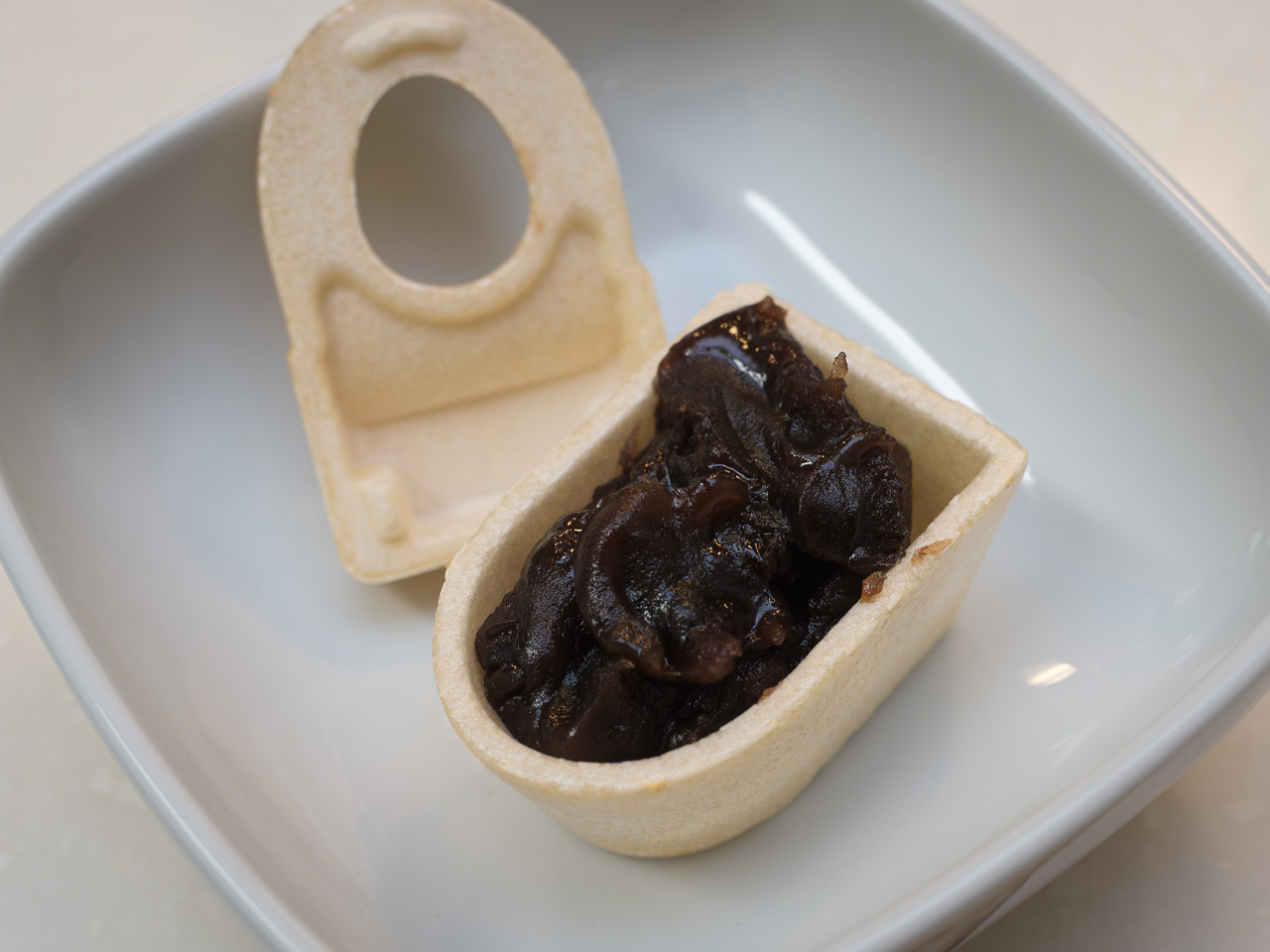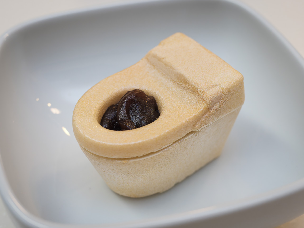 袋を開けて便器を取り出す。肉厚でガッシリした皮。あんこはちょうどいい硬さだけど、これでトグロを作るのには熟練が必要かもしれない。袋のあんこを全部絞り出すとピッタリ満タン。便座を元に戻したら完成! なかなかのビジュアルですなぁ。