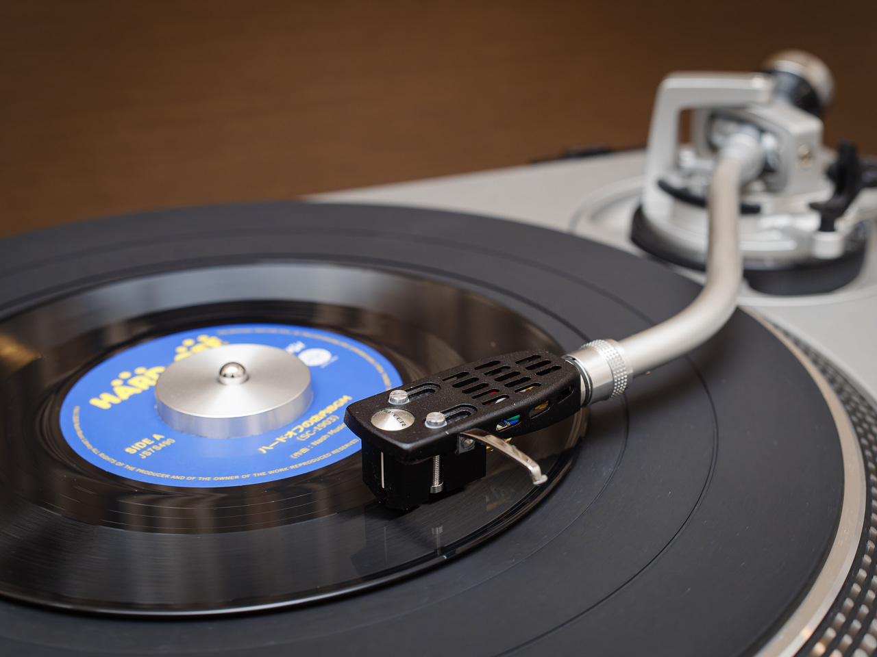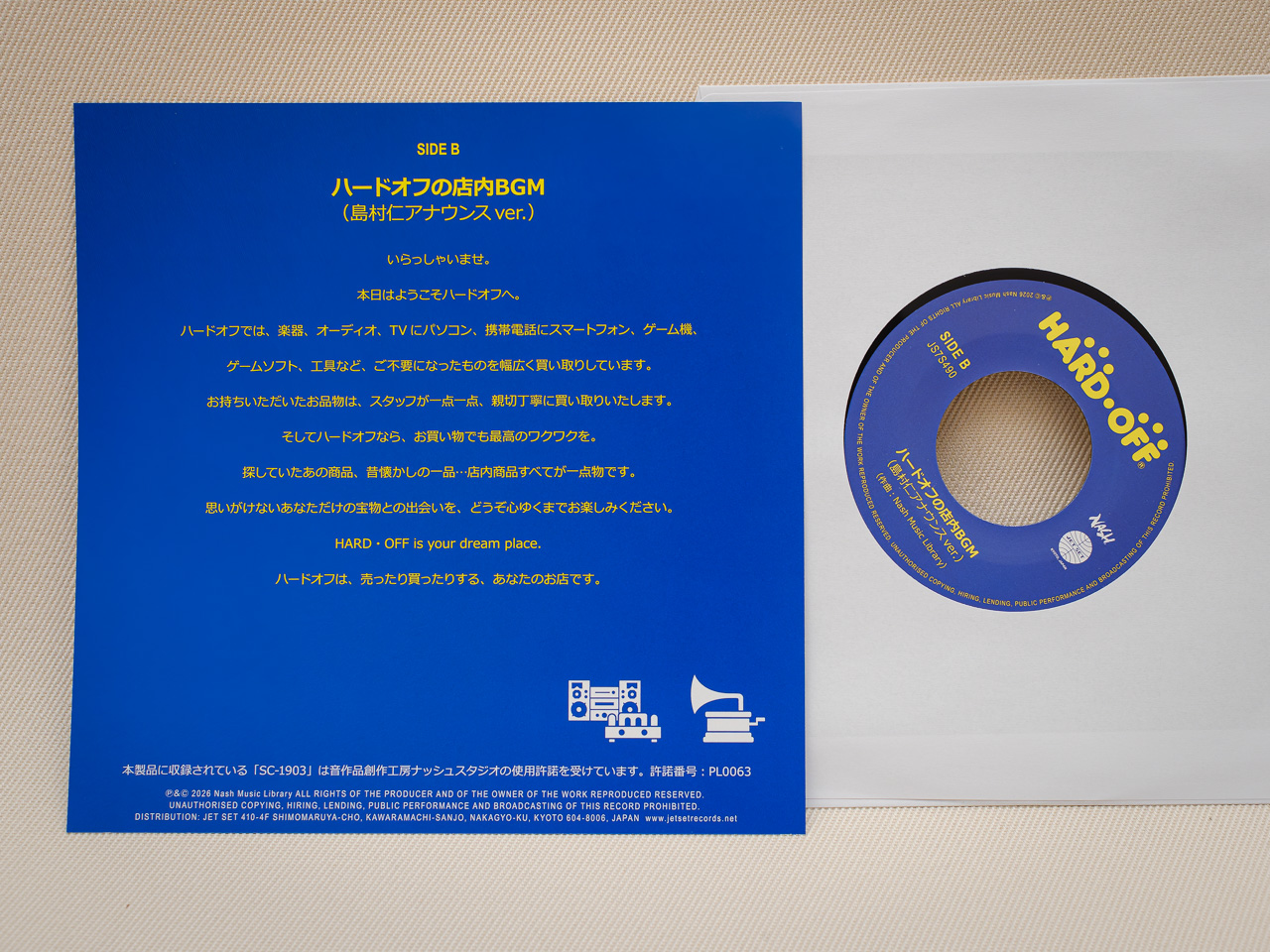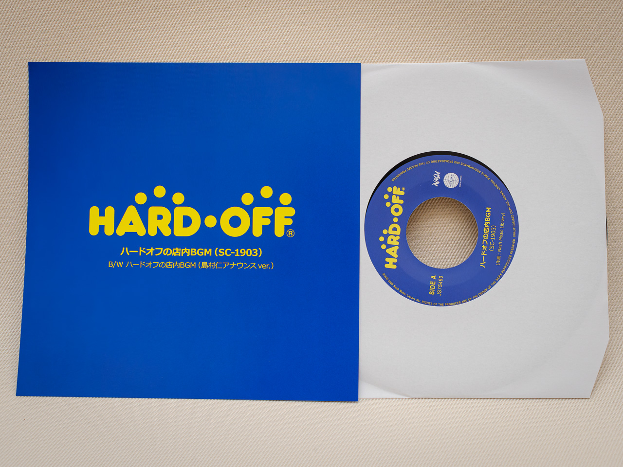 試聴に使うのは2月11日に発売になったばかりの『ハードオフの店内BGM(SC-1903)』の7インチシングルであります。みなさんおなじみの(?)この曲は、ハードオフ用につくられたものではなく、音作品創作工房ナッシュスタジオの『SC-1903』というもの。いわゆる商業利用可能なライブラリーですな。ライブラリー・ミュージック大好きだけど、シングル盤1枚2,200円はちょっと迷ったわー。手に取ってみるとしっかり厚めの盤で外袋も丈夫なものだから、これはこれで。