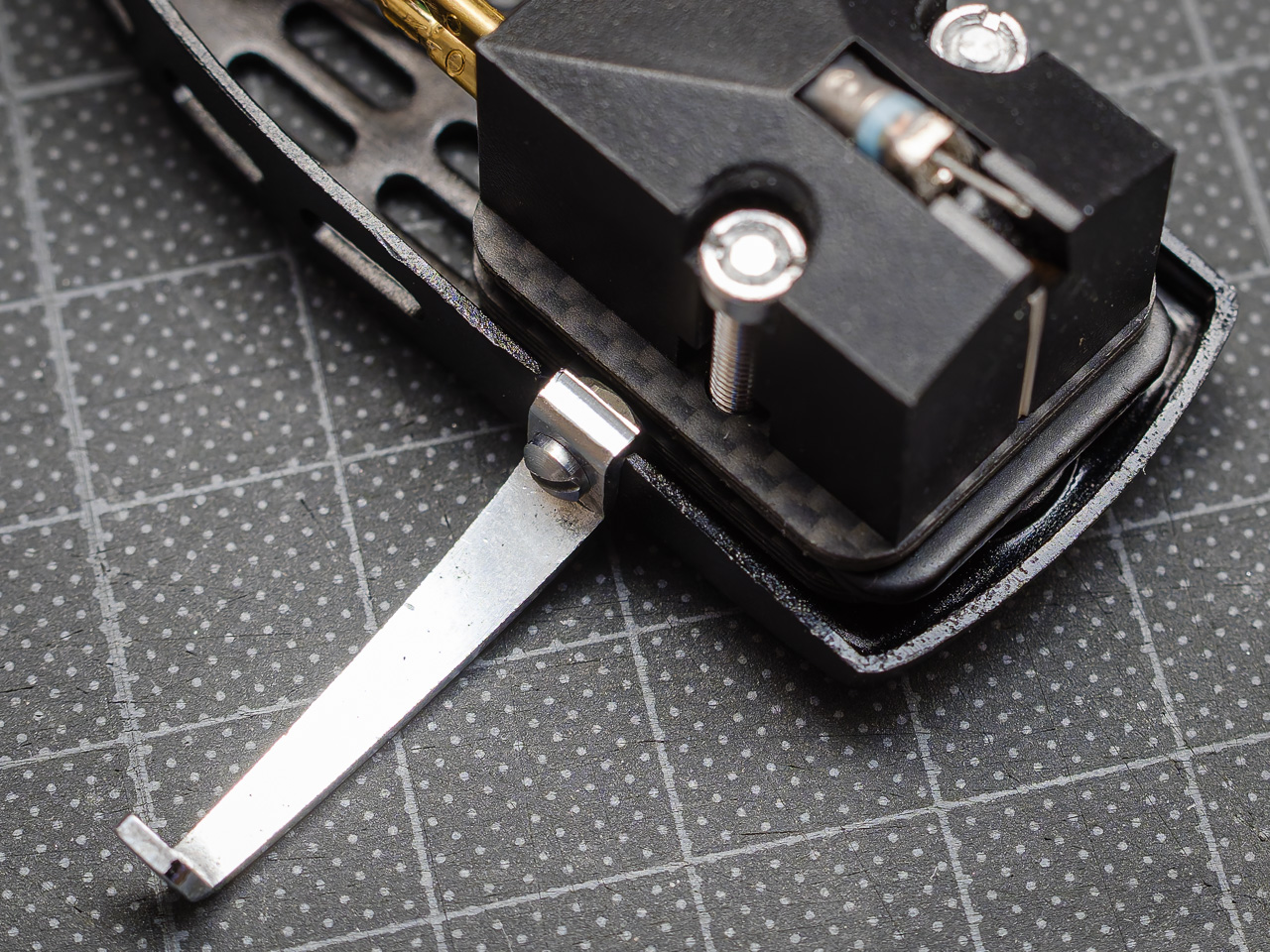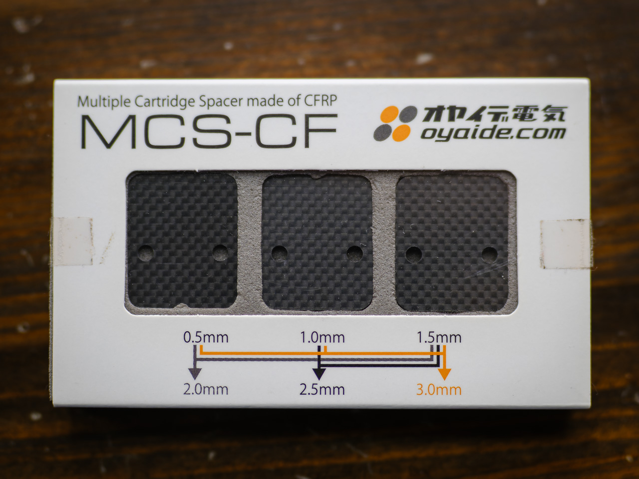 10年近く惰眠をむさぼっているオヤイデ電気のカーボンスペーサー「MCS-SF」を発掘。0.5mm/0.32g・1.0mm/0.64g・1.5mm/0.96gの3枚セットで、組み合わせで6種類に厚みを調整できるというもの。全部使うと2mm厚と1.92gを追加できる計算。