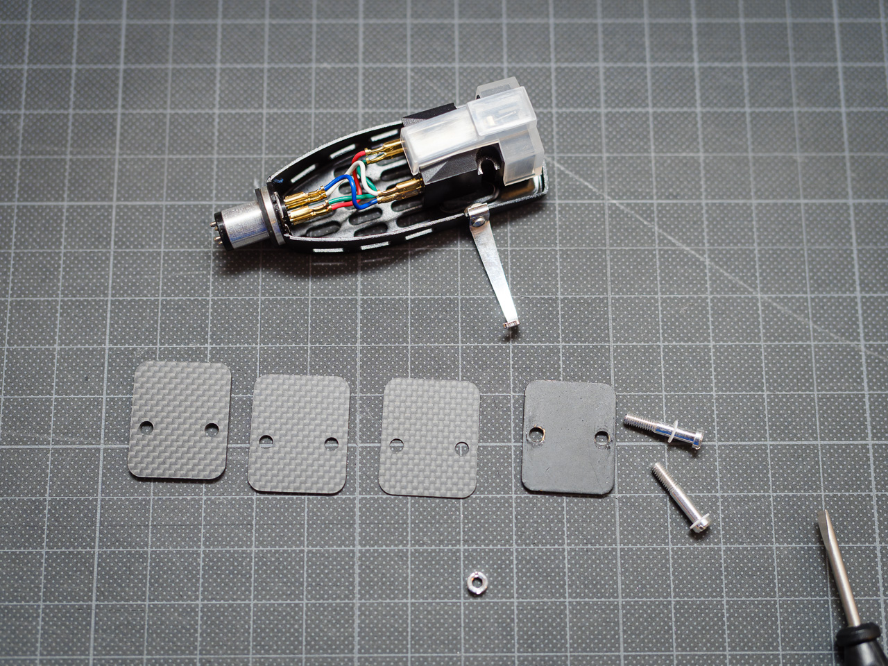 パイオニアのシェルからDL-103を取り外してカーボンスペーサーを挟み込む。効果があるのかはわからないけど、何かしらの振動があるとしたらそれを伝わりにくくするために、シェルについてきた金属ウェイトをカーボンスペーサーで挟み込むように…つまり、DL-103/カーボンスペーサー/金属ウェイト/カーボンスペーサー/ヘッドシェルという感じにしてみた。