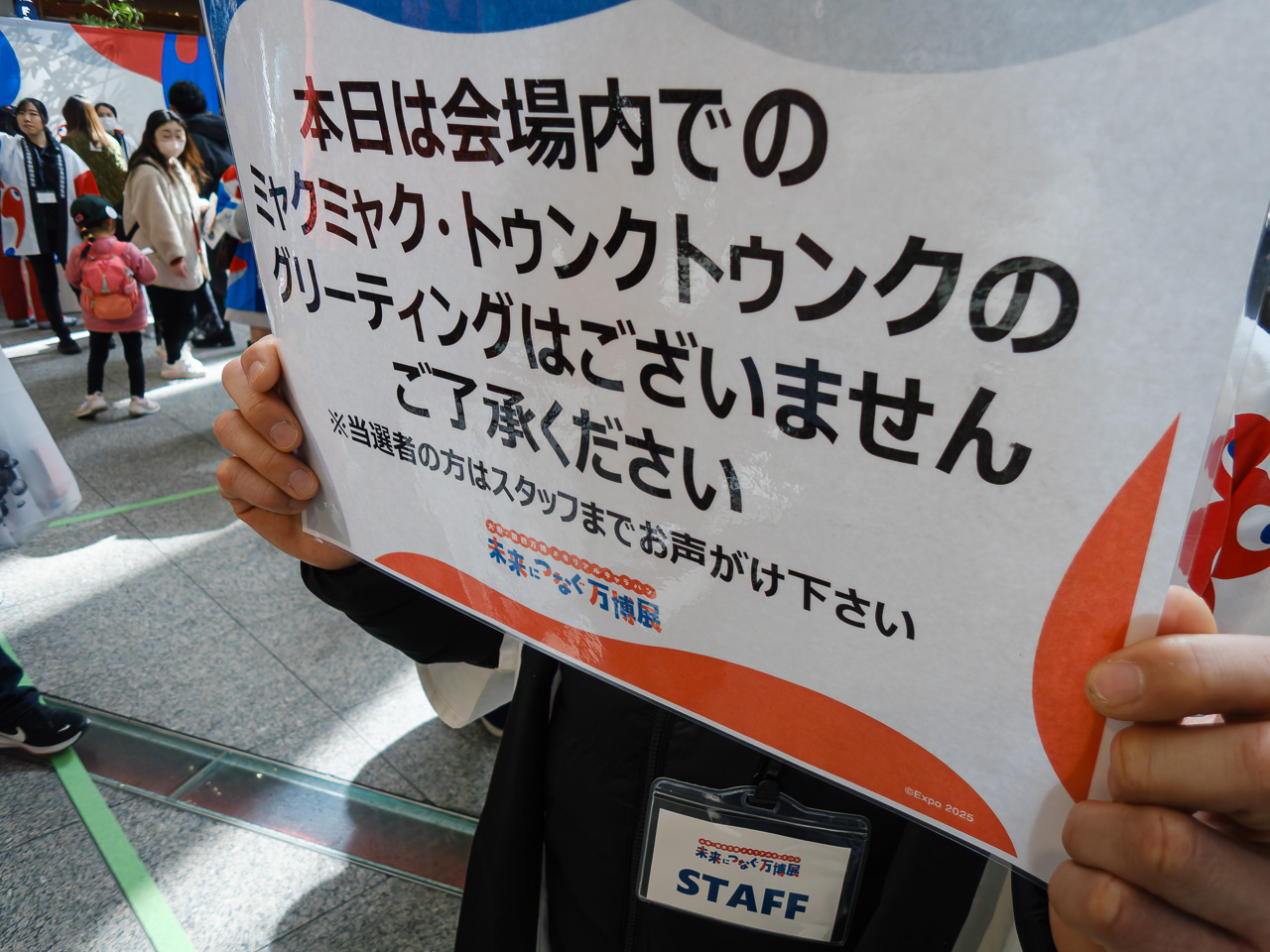 おなかを満たしたら万博メモリアル展を見に行こうじゃありませんか、ということで丸ビルに戻ると、「本日は会場内でのミャクミャク・トゥンクトゥンクのグリーティングはございません」の看板を持っているスタッフに遭遇。一緒に写真を撮れなくても、会えると思って今日ここに来た奥さまは大変なショックを受けていた。前日に何かトラブルがあったのかねぇ。