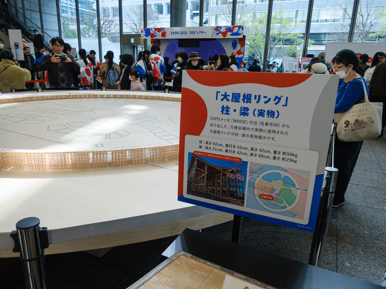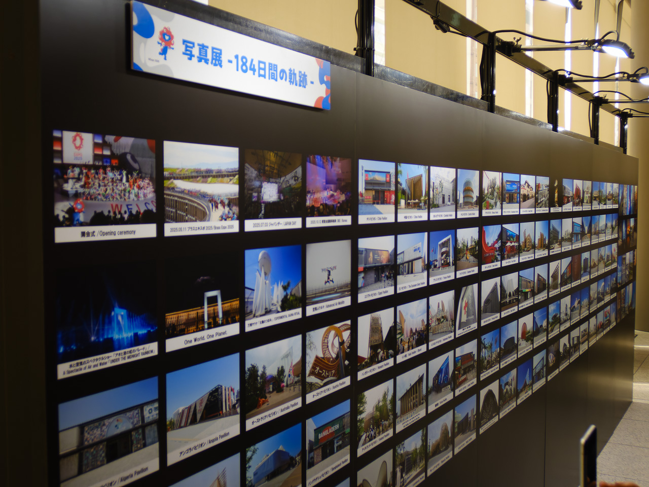 1階は大屋根リングのミニチュアや実物を切り出したもの、ほかにパネル展示が少しあって、大半は整理券が必要なVR体験コーナー。3階エリアにある「写真展 -184日間の軌跡-」と「世界のミャクミャク展」を見に行く。ここは並ばないと入れない。大阪から来たという女性と話をしつつ本日3回目の並び(笑)