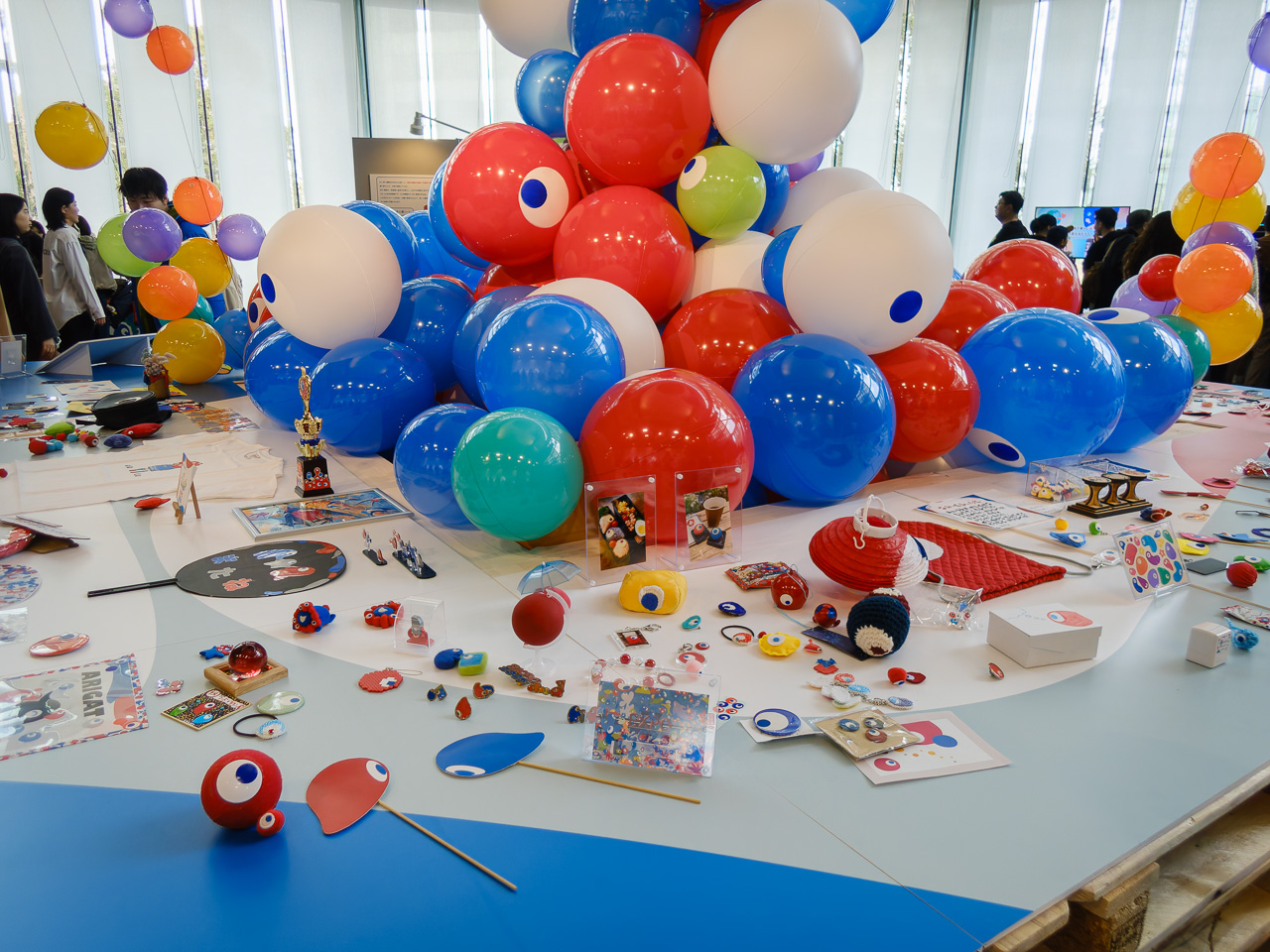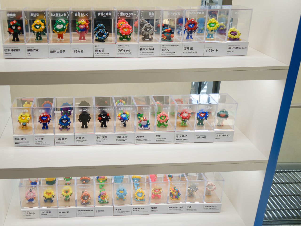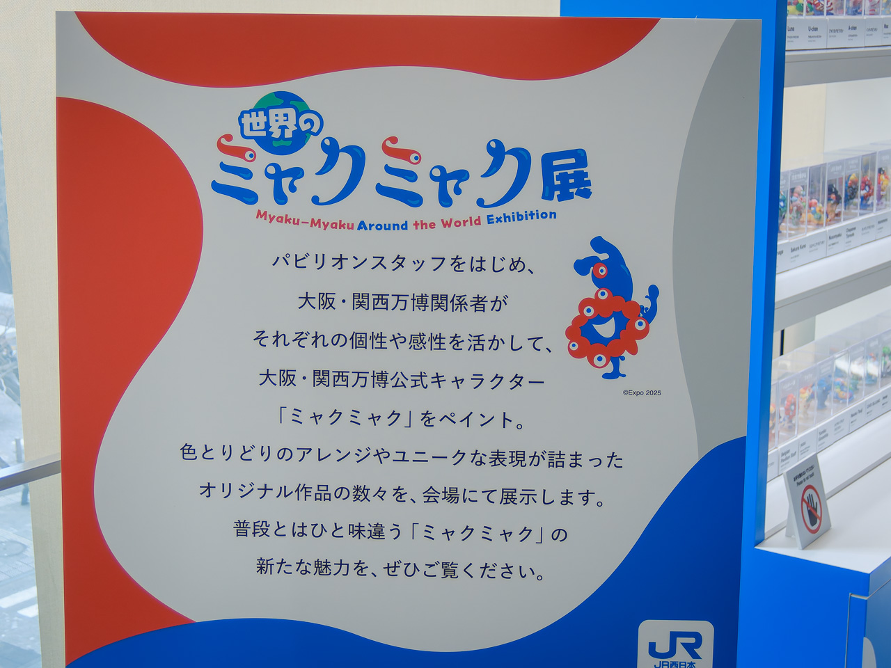 写真展は各国のパビリオンの写真中心で、「あー、ここ行ったなぁ」と思いながらさーっと通過。万博のユニフォームの展示を挟んで世界のミャクミャク展へ。これは高さ5cmくらいのミャクミャクの人形にいろんな国の人や有名人が色を塗ったもの。万博でも展示されてたものらしい。なかなか見ごたえがあって、もっとゆっくりじっくり見たかったなー。