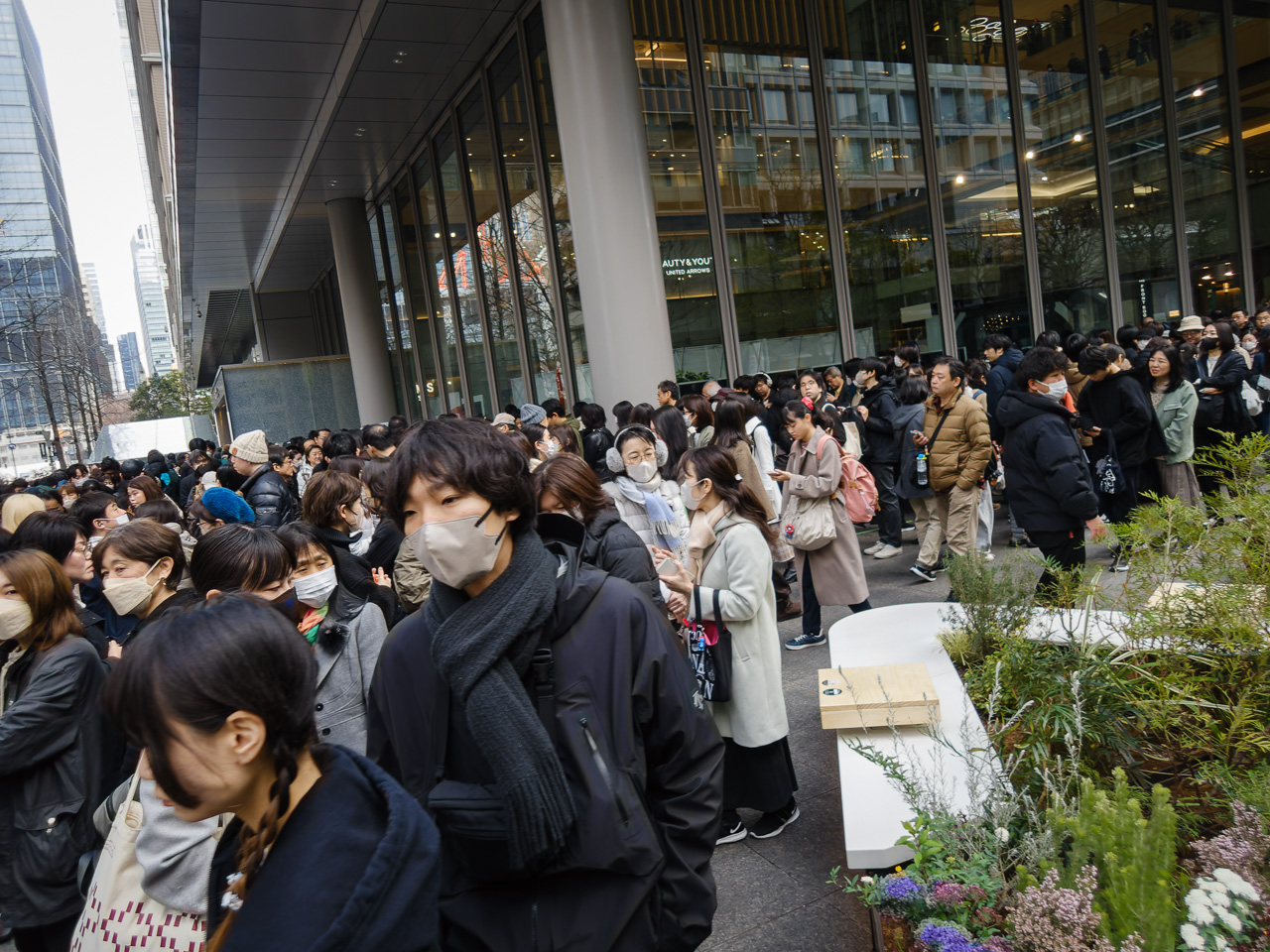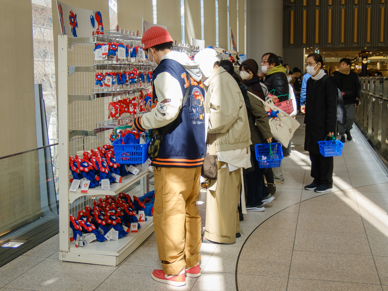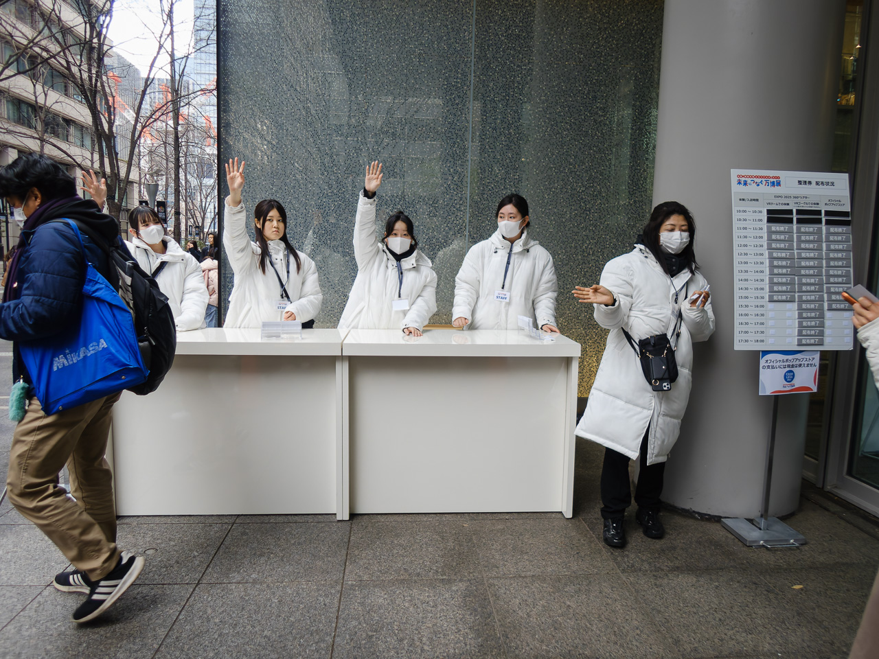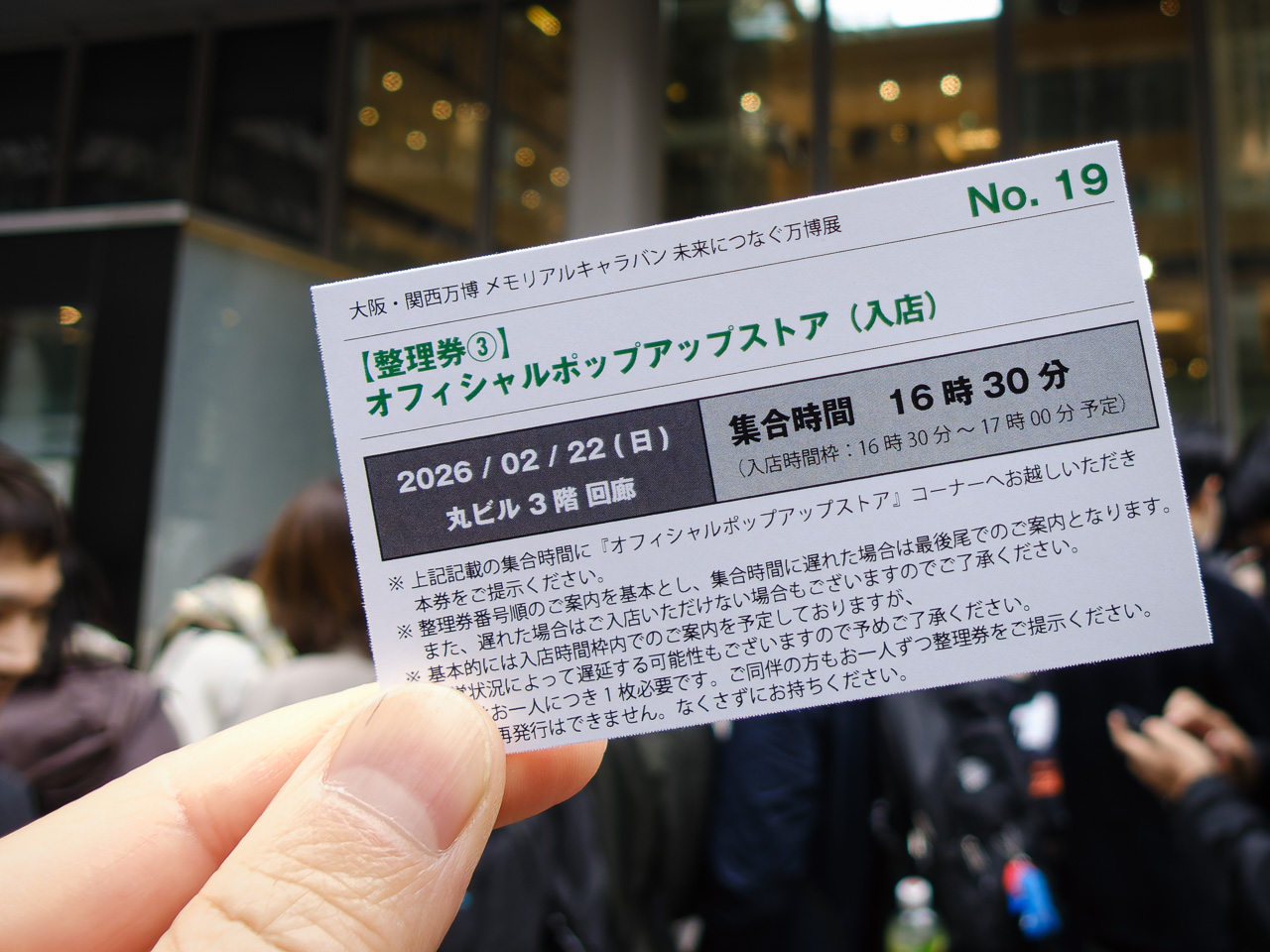 本日最初のミッションは、万博メモリアル展のVR体験やポップアップストアの整理券を入手すること。会場の丸ビルが近づいてくるとすごい行列が見えた。なるほど、ここに並ぶんですね、わかります。ミャクミャクグッズを付けてないのはぼくくらいじゃないかというミャクミャク密度の中、30分ほど並んで16時30分に入場できる整理券を確保した。VR体験の方は早々に配布終了になっていた。