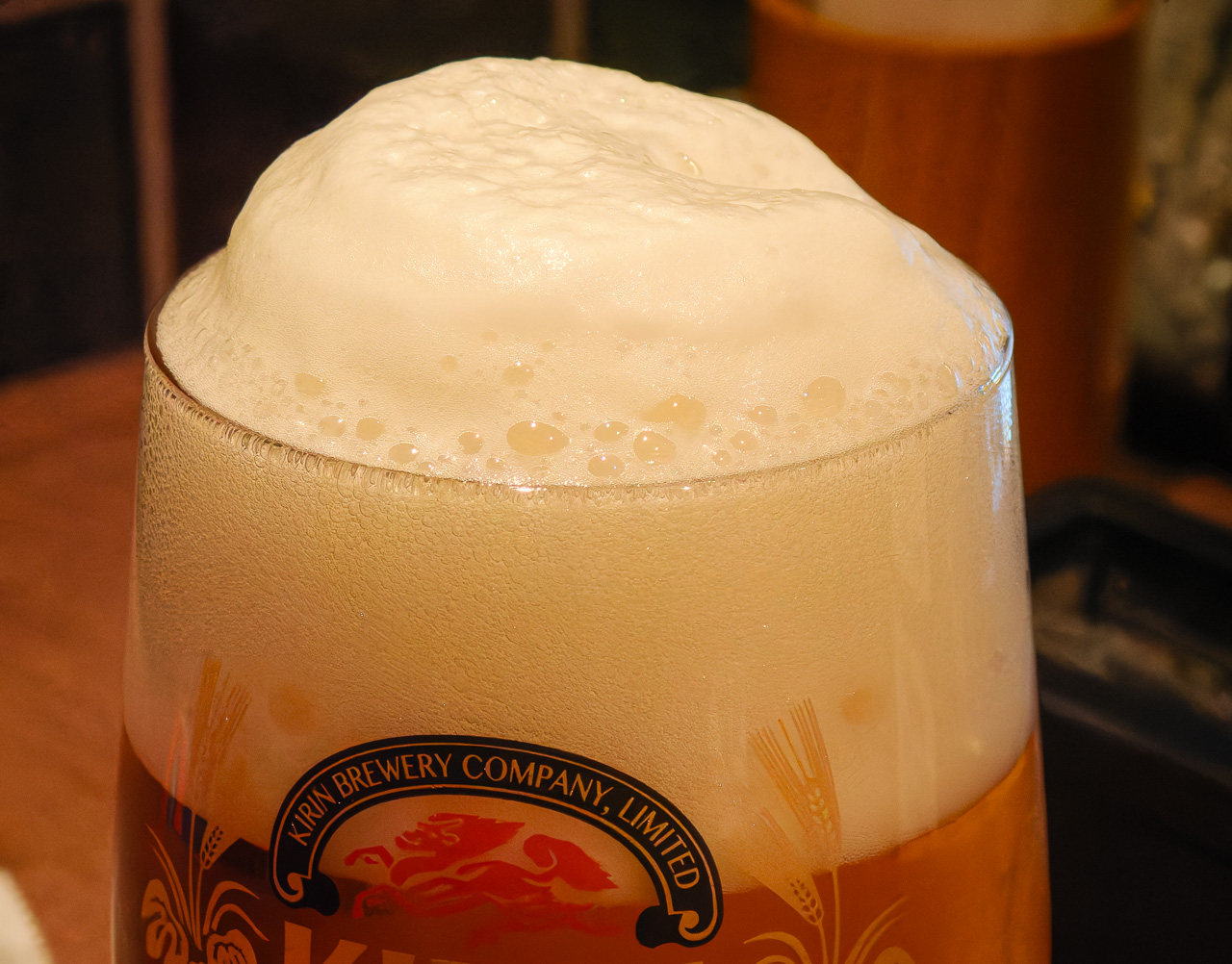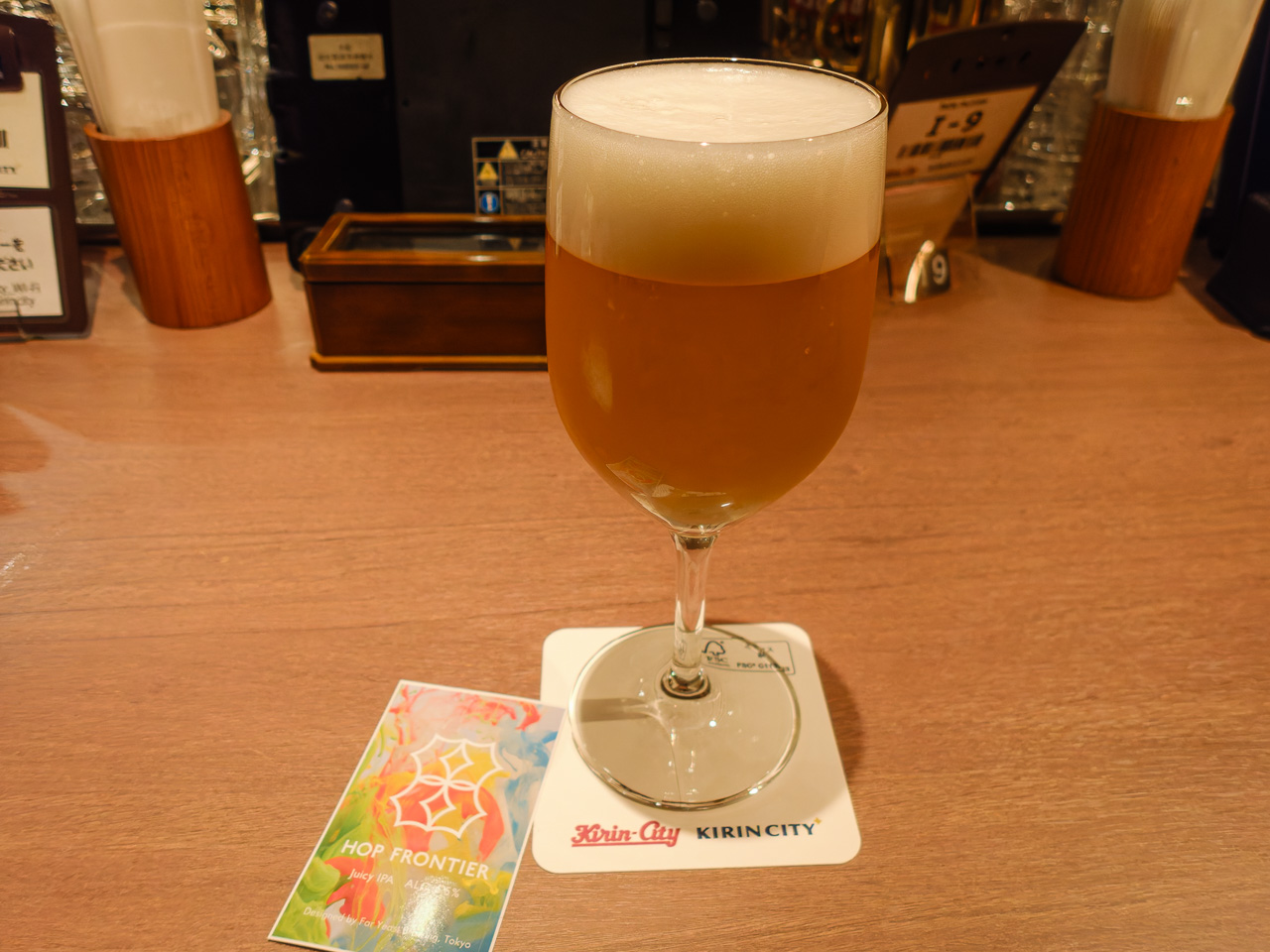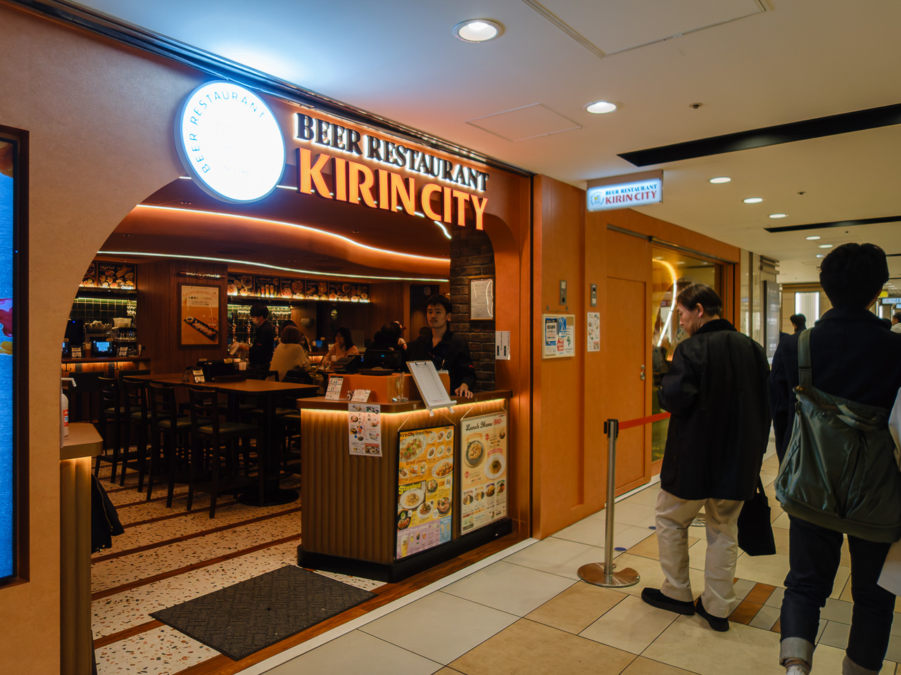 キリンシティにお邪魔するぞ! ここは並んでなくてすんなり入れた。ちょうどお昼くらいで、ランチメニューの案内もありつつ、とりあえずビールってことでビールだけを注文してしばし休憩。