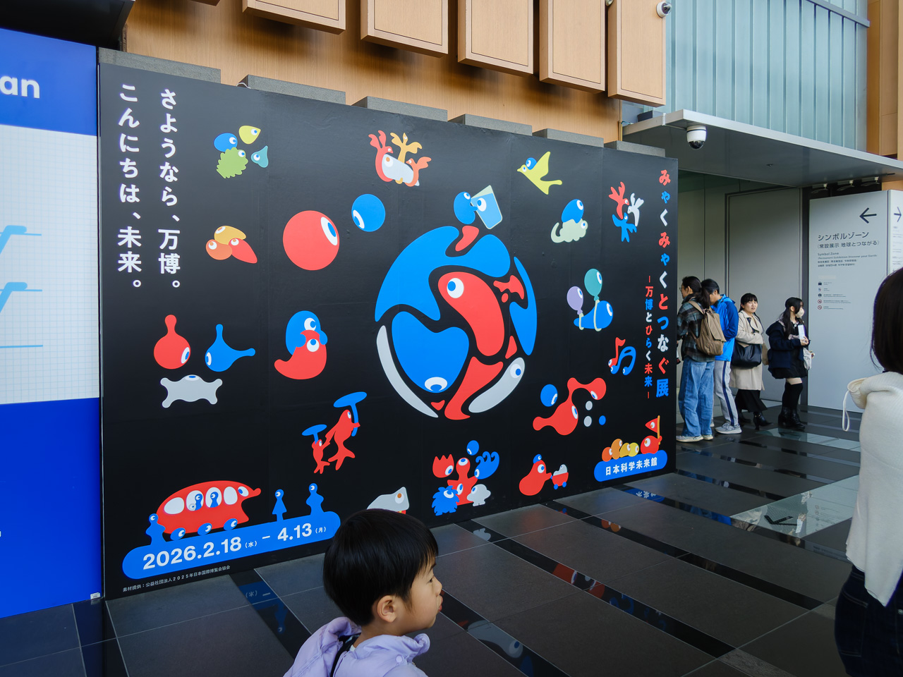 ミャクミャク・トゥンクトゥンクとの写真撮影の時間だから、もしかしたら出てくるかもしれないと思って万博メモリアル展会場に戻ってみた。が、やっぱり出てこないから、みゃくみゃくとつなぐ展 ~万博とひらく未来~(つなぐ展)を見に日本科学未来館に行くことにした。