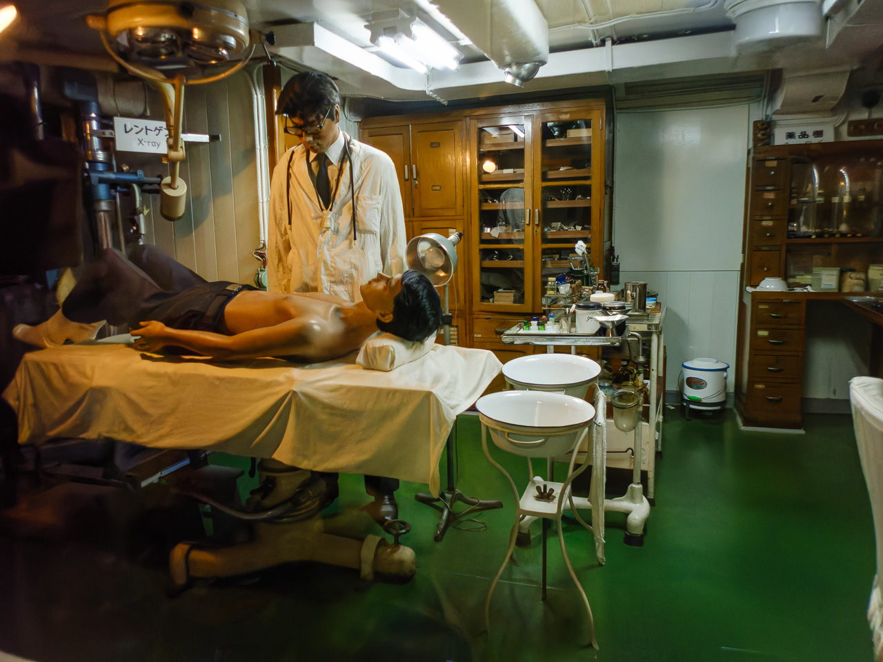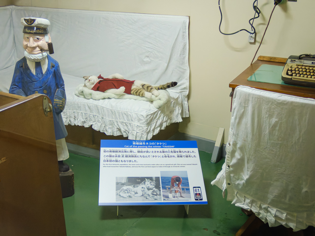 船内に入ると急にレトロな雰囲気。船室をのぞき込むと人影が…マネキンだった。各部屋にはかなりの確率でマネキンがいて、わかっていてもびっくりする。ほかには樺太犬のタロとジロに、南極越冬ネコのタケシもいた。そうだ、今日は2月22日でネコの日じゃん(笑) 南極観測船としての仕事は1956年(昭和31年)から約6年間だけだったみたい。当時の諸々の環境を考えるとかなり過酷なものだっただろうなぁ。