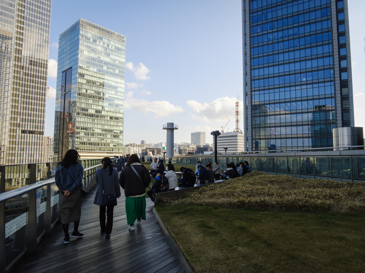 フジテレビを奥に見つつ、東京国際クルーズターミナル駅(長い!)からゆりかもめに乗って終点の新橋まで。新橋から山手線で東京駅に戻る。まだ万博メモリアル展のポップアップストアの入場まで時間があるから、午前中に通り抜けたKITTEの屋上で一休み。