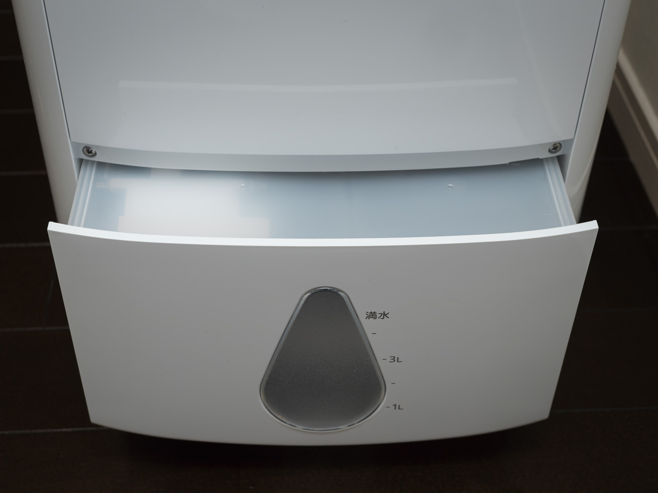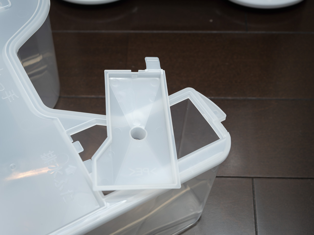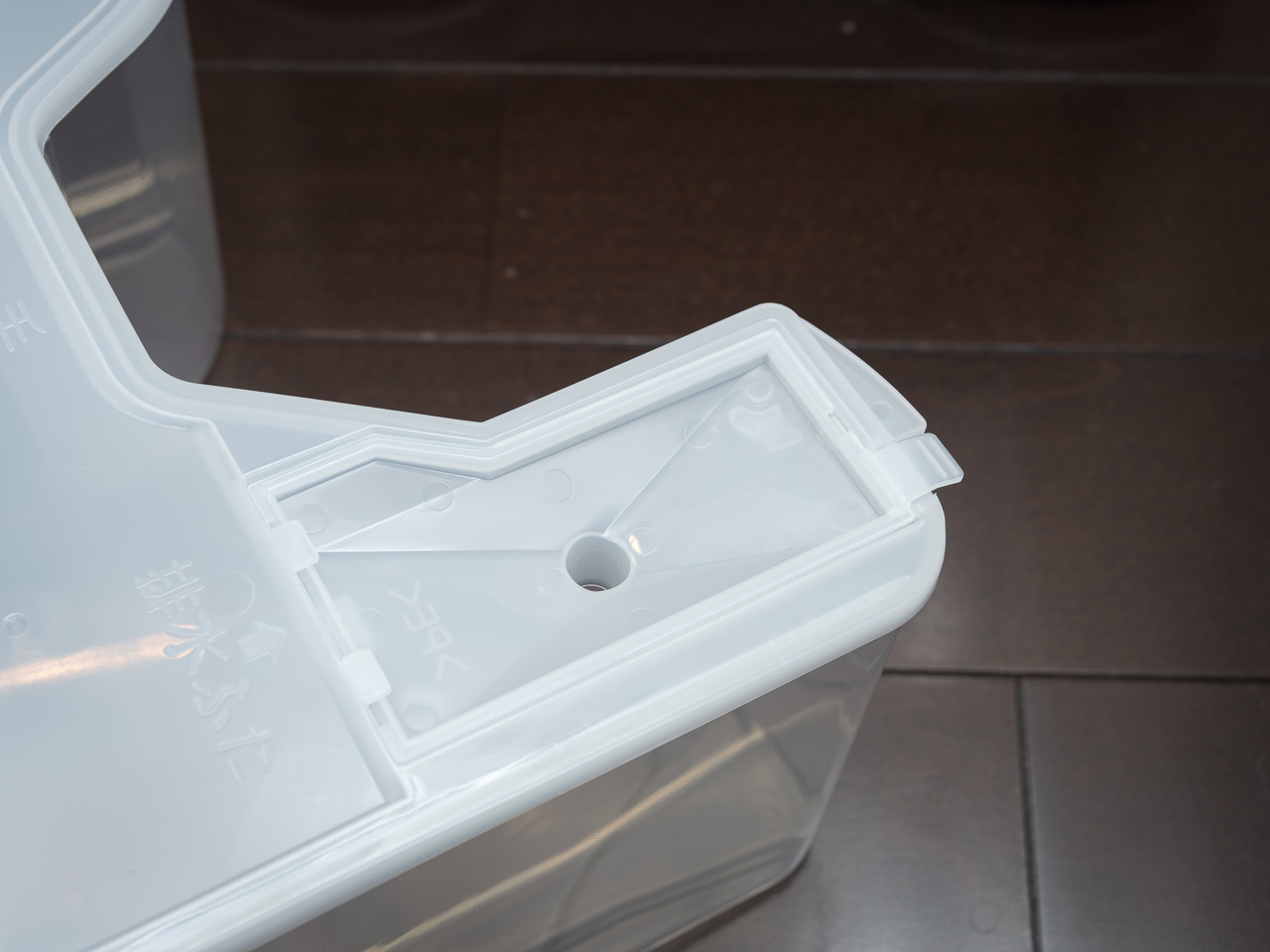 タンクの水捨て部分は別のフタになっている。2024年モデルのここはタブがちぎれることが多くて、新しいモデルでは抗菌化も含めていろいろ対策されているらしい。排水タンクを勢いよく「ゴッ!」と戻していたのが故障の原因だったかもしれないから、これからは優しく戻すことにする。
