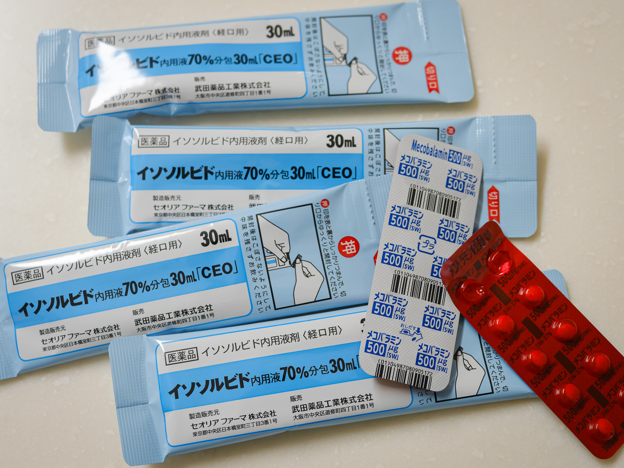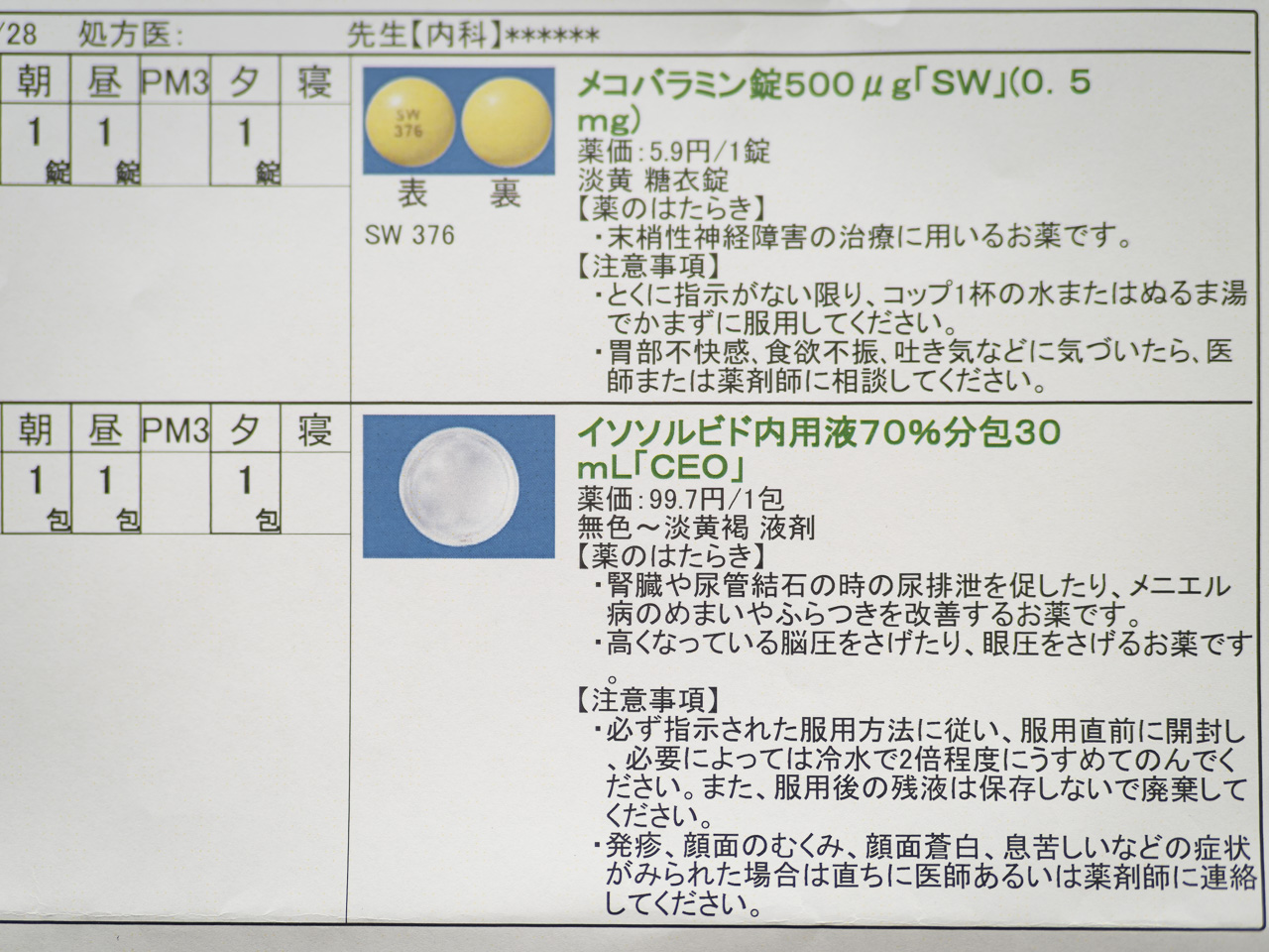 メニエールは内耳にリンパ液が過剰にたまってしまう病気で、その原因かもしれない抹消神経障害の薬(ビタミンB12)と、脳圧・眼圧を下げる(リンパ液を排出する)薬を処方してもらった。この脳圧・眼圧を下げるイソバイドという薬はとてもマズイことで有名。プラスチックの液体を飲んでいるような無機質な味と香り。初めてイソバイドに遭遇した時は1リットルの専用ペットボトルに入っていて、冷蔵庫に保管しながら量って飲むスタイルだった。その後、1回分ごとのアルミパウチに進化して、今回は子供のころに飲んだシロップ薬くらいのマズさまで味が改善されていた。が、舌の奥の左右にいつまでも風味が残る感じは変わらず。